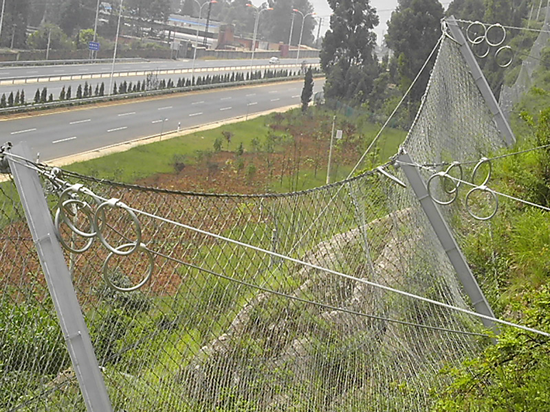 被动防护网是由钢丝绳网、高强度铁丝格栅网、锚杆、工字钢柱、上下拉锚绳、消能环、底座及上下支撑绳等部件构成。系统由钢柱和钢绳网联结组合构成一个整体,对所防护的区域形成坡面防护,从而阻止崩塌岩石的下坠,起到边坡防护的作用。