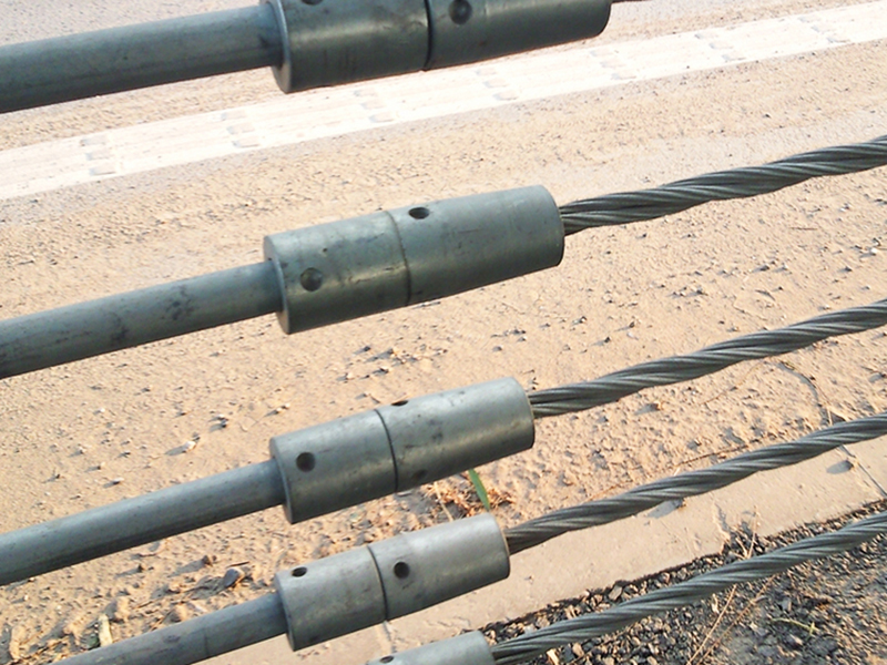 缆索护栏是柔性护栏的主要代表形式,它是一种以数根施加初张力的缆索固定于立柱上而组成的结构,它主要依靠缆索的拉应力来抵抗车辆的碰撞,吸收碰撞能量。缆索护栏属柔性结构,车辆碰撞时缆索在弹性范围内工作,可以重复使用,容易修复。立柱间距比较灵活,受不均匀沉陷的影响较小。风景区公路采用缆索护栏较为美观。积雪地区,缆索护栏对扫雪的障碍稍少。但缆索护栏施工复杂,端部立柱损坏修理困难,不适合在小半径曲线路段使用;同时它的视线诱导性较差,架设长度短时不经济。